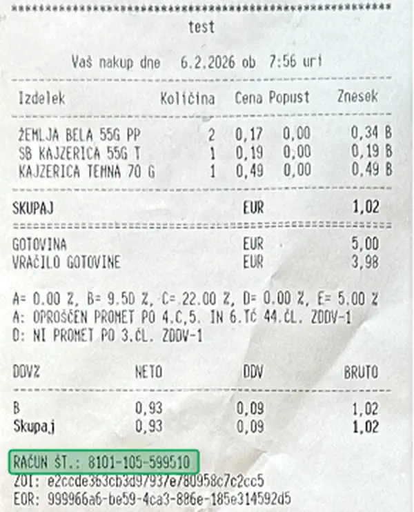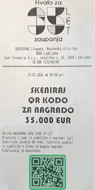 Opravite nakup v vrednosti vsaj 10 € in nato skenirajte QR kodo na računu ali vnesite številko računa na https://spar35let.si/.
