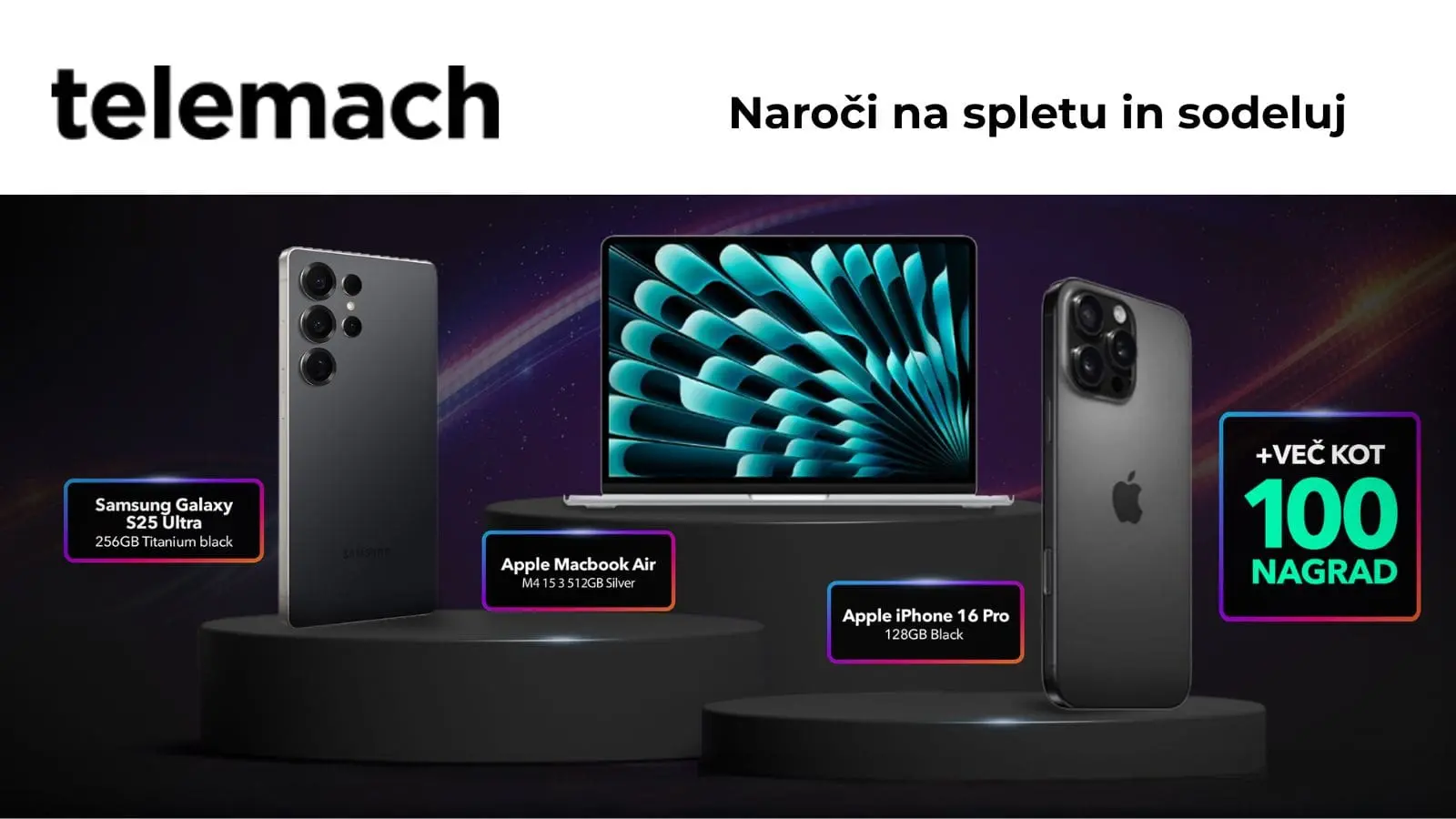 Pridružite se Telemachu to poletje in sodelujte v veliki spletni nagradni igri z več kot 100 ekskluzivnimi nagradami! Med njimi vas čakajo vrhunske naprave kot so Apple MacBook Air, iPhone 16 Pro, Samsung Galaxy S25 Ultra, in še veliko drugih nagrad.